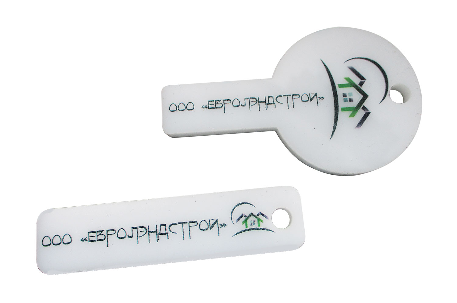 Бейдж фигурный из белого акрила с логотипом, нанесённым методом УФ печати.